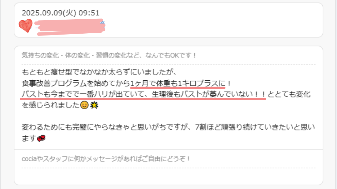 これまで食べても太れなかったというN様は、体重が増えた!バストにハリが出た!と喜んでくださいました^^💕