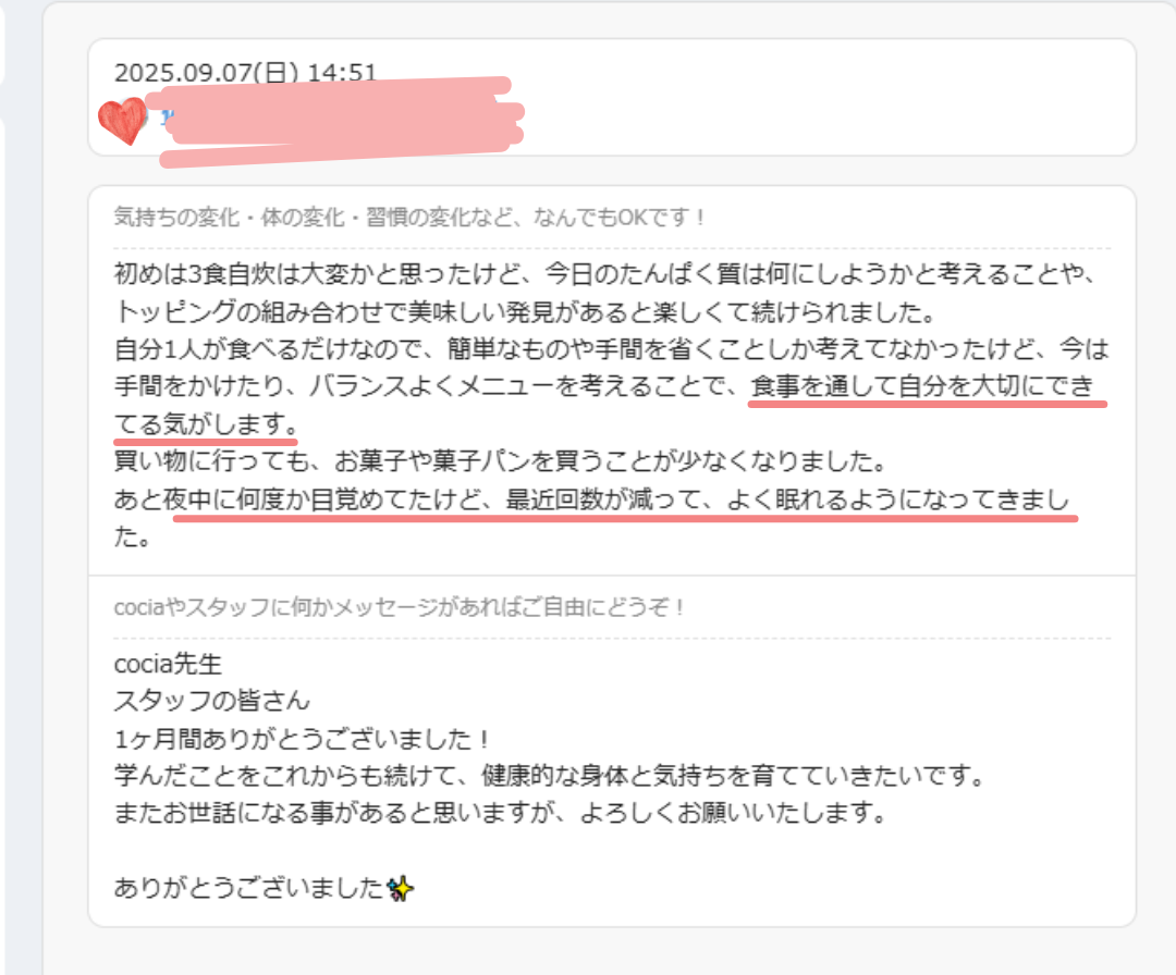 元々は菓子パンだけだった方、間食がやめられなかった方、朝ごはんを抜いていた方、野菜が苦手で全然食べていなかった方などなど、もとの食事から比べると大きく変化した方も多かったです👏